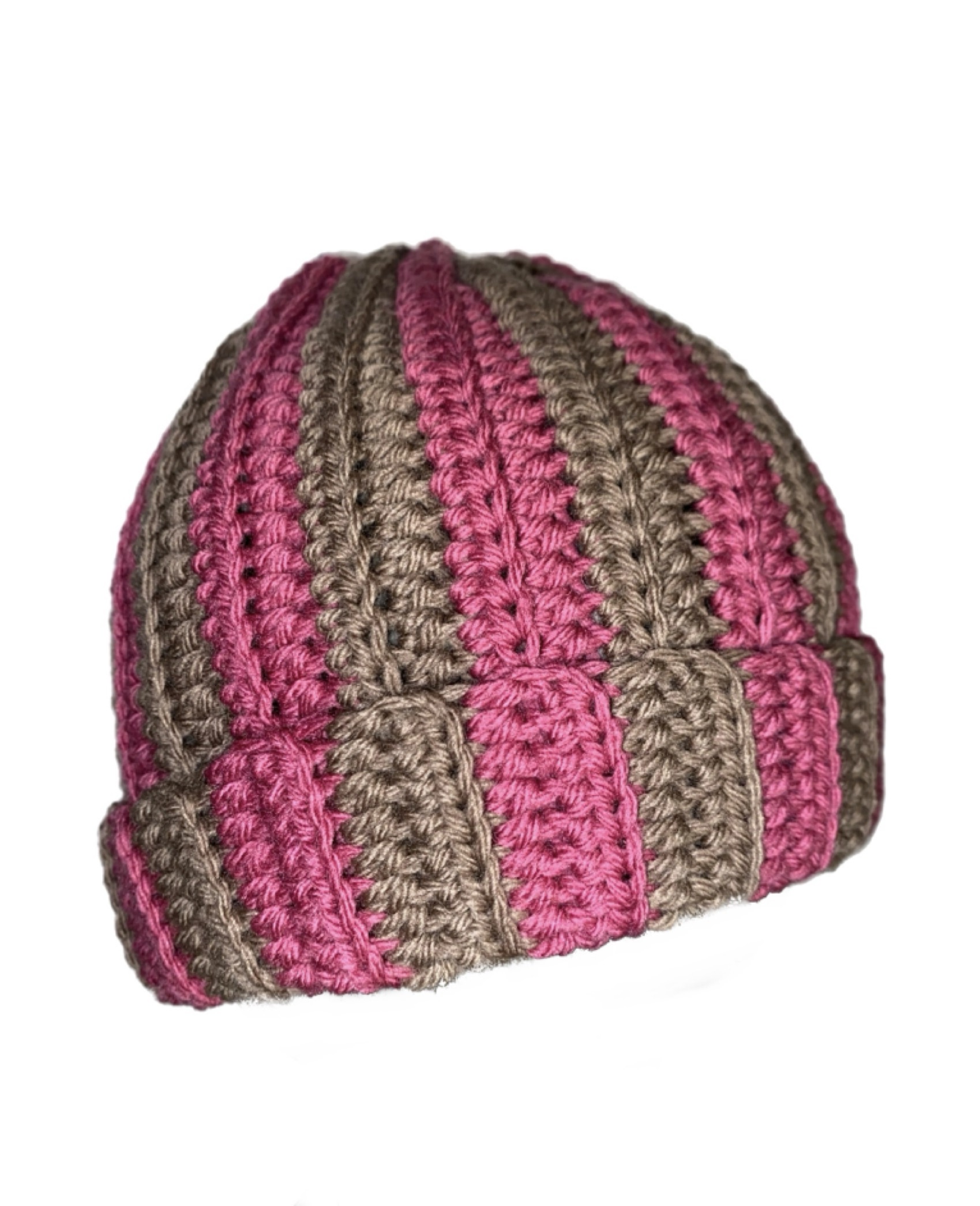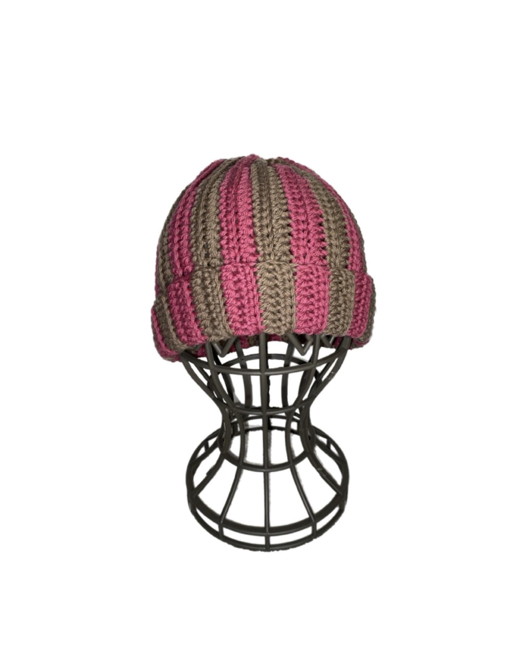 Bonnet rayé marron et rose réalisé en crochet. Taille unique.